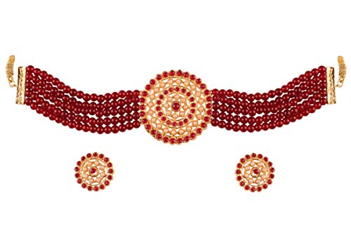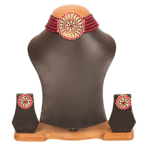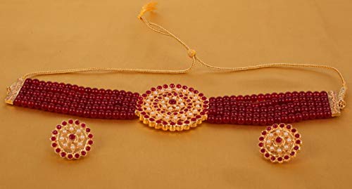 Alloy metal, Indian royal era inspired pretty studded style faux pearls choker necklace set in gold tone.