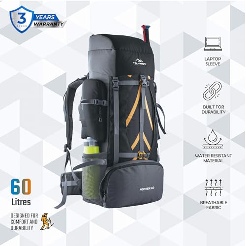 TRAWOC 60 Ltr Travel Backpack Hiking Trekking Rucksack Bag, 3 Year Warranty, Black