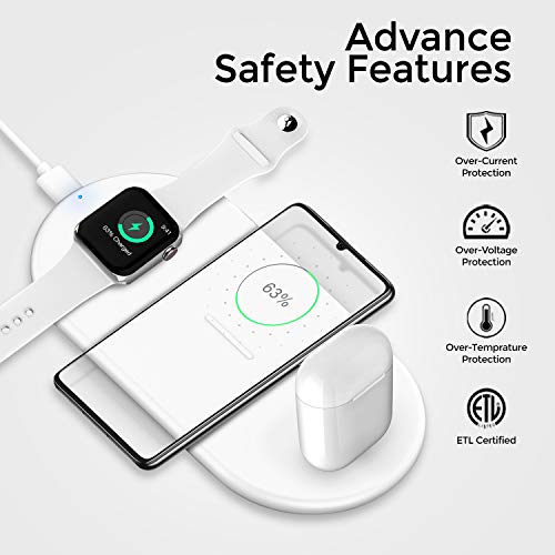 【Safe Convenient To Use】This one-stop 3 in 1 wireless charging board has passed Qi, CE, FCC, RoHS certification. The built-in intelligent protection system can effectively prevent overcharge, over-discharge, overvoltage, overcurrent, overpower, overheating, and short circuits. It is not only safe to use, but also energy-saving, and it improves the charging efficiency more effectively. Facilitate your life in all aspects.