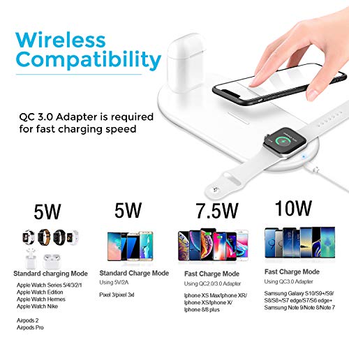 The 3 in 1 wireless charging station can reduce your charging cable on your desk for different devices, only need one cable,save place and look neatly.Charge your QI enable Phone, AirPods, and Watch at the same time.Three wireless charging modes for your phone: 7.5W, 5W, 2.5W.Advanced temperature control, overvoltage protection, and more combined with full CE, FCC, certification for complete peace of mind.Made of premium material, keep your devices away from scratching.Easily install and convenient to use.