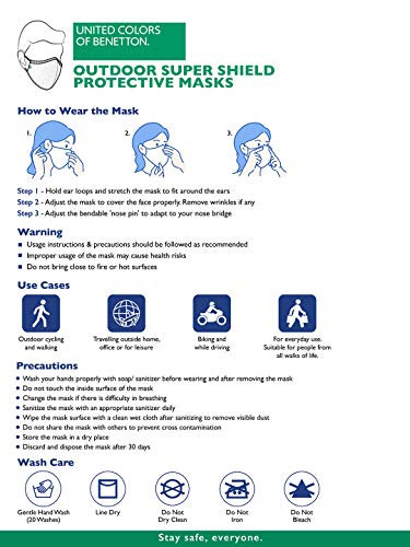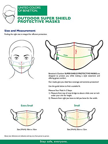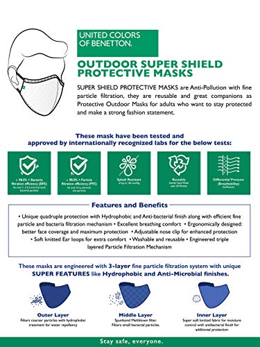 Benetton’s Pack of 3 SUPER SHIELD PROTECTIVE MASKS are Anti-Pollution with fine particle filtration, reusable and great companions as Protective Outdoor Masks for kids for a strong fashion statement. These masks are engineered with 3-layer fine particle filtration system with one of their kind SUPER FEATURES like Hydrophobic and Anti-Microbial finishes. 3-Layer SUPER PROTECTION fine Particle Filtration System Outer Layer – Filters coarser particles with hydrophobic treatment for water repellency Middle Layer – Spunbond Melt Blown filter – Filters small bacterial particles Inner Layer – Super soft knitted fabric for moisture control with antibacterial finish for additional protection