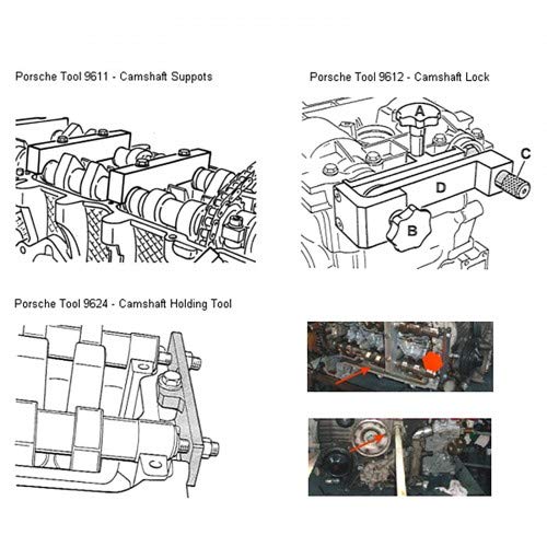 Applicable Model: 911 (996 / 997) Boxster (986 / 987) Will Not Work On M96 / 03 3.6L H6 Engine Contents: 9595 – 1Pc TDC Alignment Pin 9612 – 1Pc Camshaft Locking Tool 9611 – 2Pcs Camshaft Supports 9634 – 2Pcs Camshaft Holding Tool 9608 – 1Pc Alignment Tool 9602 – 1Pc Pin Driver and Extensions Get The Professional Kit For Your Work Shop And Garage. You Can Insert The Wrist, Lock The Crankshaft, Position The Connecting Rod As Well As Camshafts, And Retain The Camshafts.