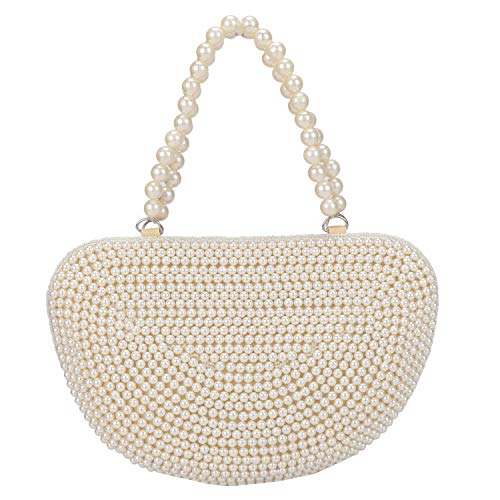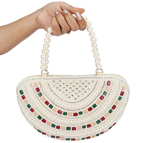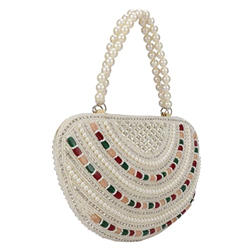 VANYA HANDICRAFT COLLECTION Women’s Multicolour Stone in Vintage Style Pearl Tote Purse Wrist Bag (Off White)