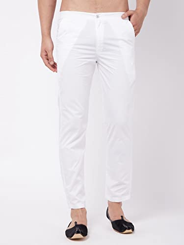 Cotton lycra pant style pyjama in white color, has full length, elasticated waist band, side pockets, and zip fly closure.