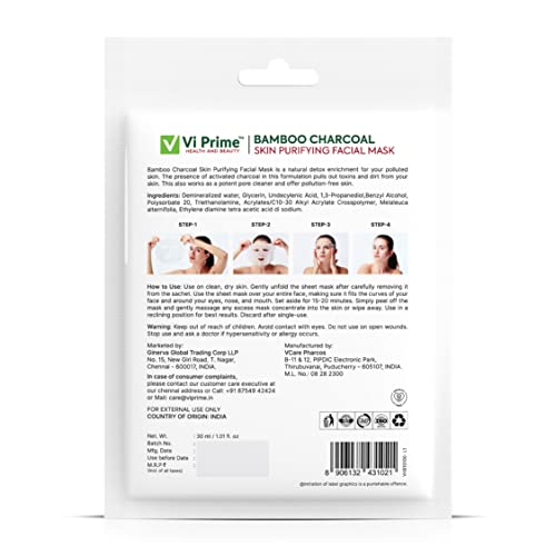 The bamboo charcoal facial pack reduces impurities effectively. As per analysis, it has indicated that activated charcoal can easily pull out the toxins in your body, and applying bamboo charcoal skin purifying face mask for skin can terminate impurities and dust from your skin The activated charcoal face mask sheet can absorb bacteria and pollutants from the skin, and act as a potent face dust remover to improve your tone and fight acne The bamboo charcoal skin purifying face mask effectively cleans blocked pores of dirt and impurities, the build-up of which causes acne, and blackheads removal on the nose Charcoal facial masks for women are common in skincare products, because of their absorption capacities. This jet-black powder can attach to minor, aggravating substances that get under our pores and cause dust and chemical buildup Vi Prime Bamboo charcoal skin refreshing face mask sheet is very easy to use and effective. You can also use it in your break time and reap the benefits.