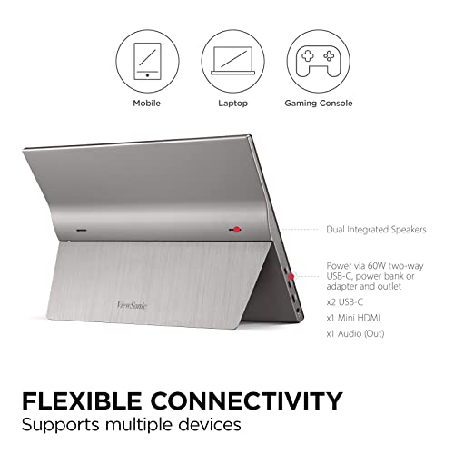 ViewSonic Portable Monitor Vg1655 15.6 Inch (39.62 Cm), 1920 X 1080 Pixels IPS Panel, Frameless Design, 2 Way Powered 60W USB C, Dual Speakers, One Cable Solution, 0.9 Kgs Light, LCD, Metalic Silver