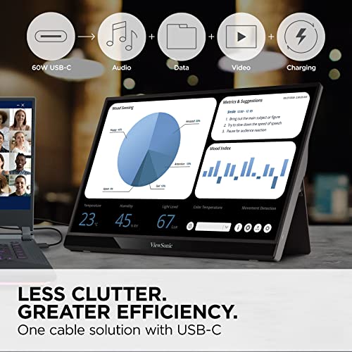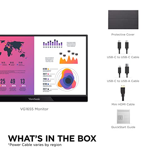 The ViewSonic VG1655 is a portable 16” Full HD monitor perfect for overcoming one-screen limitations outside the office. Extend the screen from phones, tablets, or laptops for mobile work, one-on-one presentations, or leisure entertainment. The two universal USB Type C connectors provide a one-cable solution for audiovisual and power signal transmission. The adjustable wide stand and pivot-able display will support your working angles. With the anti-slip cover, metal case, and aluminum stand, reliability is embodied in the design.
