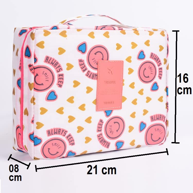 Viulvuk Multipurpose Travel Cosmetic Makeup Pouch | Multi Pockets Toiletry Bags & Travelling Pouches for Girls | Inner Ware Storage Organizer & Wash Bag for Women – Pink Smiley (Size: 21x16x08 cm)
