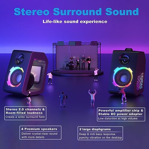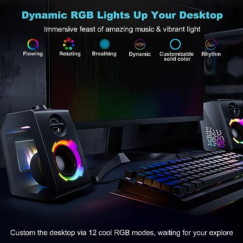 Dynamic RGB PC speakers for desktop: Immersive feast music with ears and eyes via lighting up the RGB PC speakers, enjoy the perfect brightness neither dazzling nor dim. The vibrant RGB lights get on well with your desktop atmosphere. 8 lighting combs and 12 RGB options make you feel free to customize your desktop setup. (Circling, rhythm, flowing, solid, waving, etc., see the video for details)