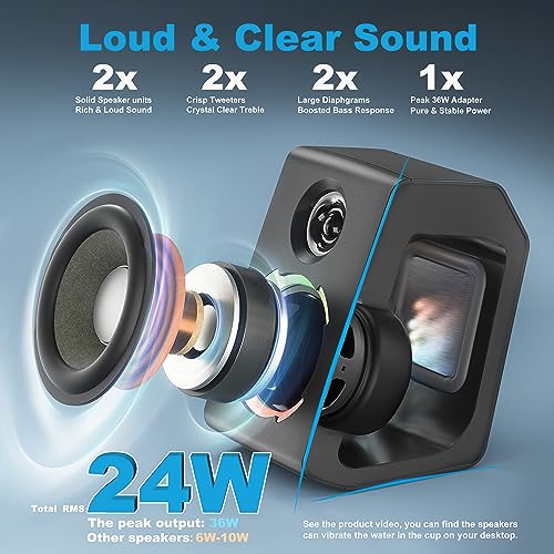 Rich and deep bass response: The 2″*2″ large bass diaphragms, combined with solid full-range speakers, deliver rich and deep bass, to enhance your sound experience for movies, gaming, and music. For more bass preference, turn up the volume to around 90% both on speakers & phones. The compact bodies of the 12 oz coffee cup size help you to get rid of the bulk & heavy subwoofers, saving the footprint and having a neat desktop. Small body with good bass.
