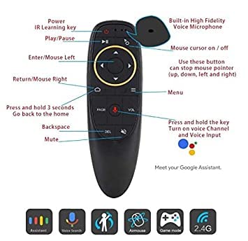 Voice search function: Only Works When You Have Google Assistance Installed, All you have to do is ask. Speak into the voice remote control and TV Box searches for what you want. Ask for the best in action movies, today’s weather, or the latest celebrity news. Air mouse & Gyroscope Function, With 3-Gyro + 3-Gsensor, it’s more convenient to easy operate in horizontal and vertical mode. IR Learning Function, Only the “Power” button can program / learning Function. For Smart TV or Smart Projector users, before purchasing, please make sure that your TV or Projector can be connected to a mouse