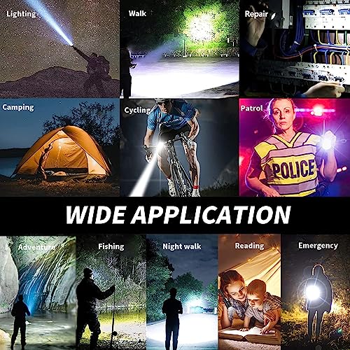 【LONG LASTING & WIDE USES】Flashlights high lumens rechargeable has been completely upgraded, overcharge and discharge protection, the working time is up to 3-8 hours, charging time is up to 4 hours. Tactical flashlights high lumens is not only suitable for night camping, dog walking, running, fishing, riding, hiking, but also for power outage, emergency, police, night patrol, car maintenance and other workplace.