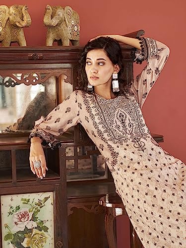 Womanista Women’s Beige Ethnic printed cotton blended kurta with flared sleeves(Kur258_M)