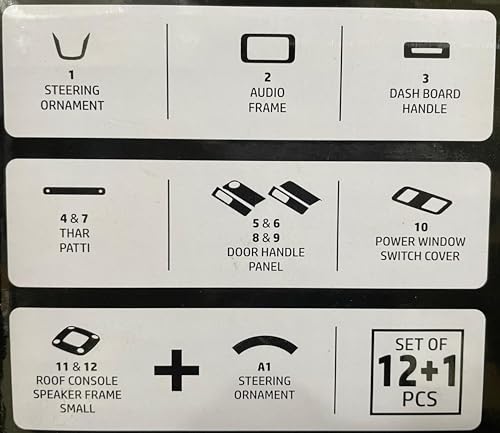 Package Content: Steering Ornament (U shape cover 1 pcs and 1 pcs rounded), Thar Patti Door Handle Panels (2 pcs patti, 2 pcs small and 2 pcs big door handle), Audio Frame (1 pcs), Power Window Switch Cover (1 pcs), Dashboard Handle (1 pcs), and Roof Console Speakers (2 pcs)