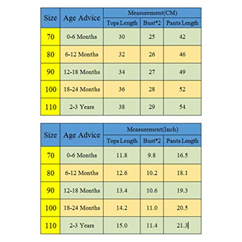 Size 90——Tops Length 34cm/13.39in——Bust 54cm/21.26in——Pants Length 49cm/19.3in——Advice Age 12-18 Months