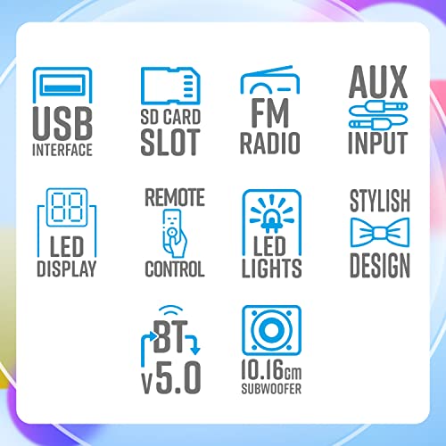 Remote control | LED display on Subwoofer | LED lights on front | Stylish design.