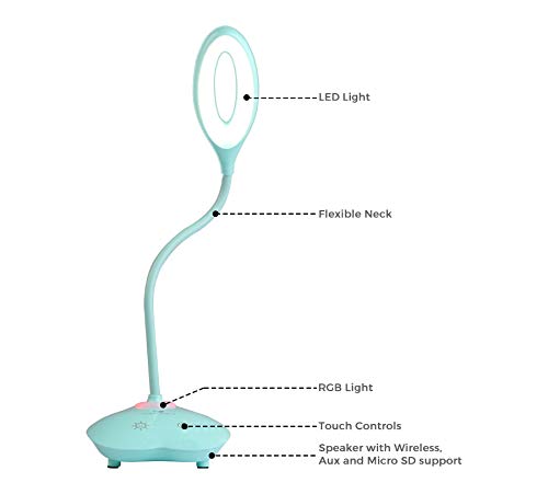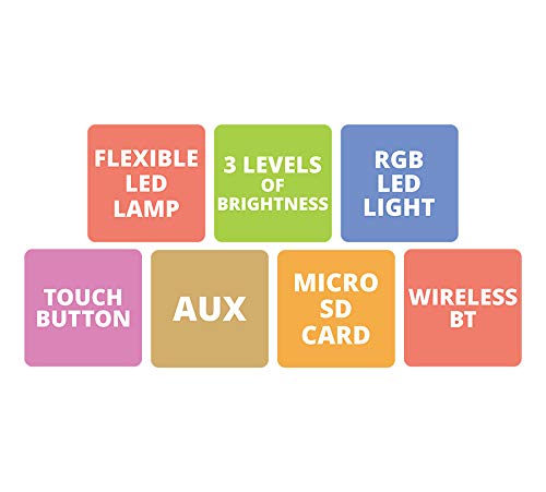 Features: Wireless BT, Supports Micro SD card, Flexible LED Lamp with 3 levels of brightness adjustment, AUX Input, Media control & Built-in Rechargeable battery