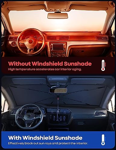 【Protect Car Interior & Sun Protection】:Our car umbrella windshield sun shade can protect your car’s interiors by blocking the Sun Heat & UV rays. Our car window shades bring down the heat buildup inside the cabin,Silver side reflects UV Ray and black side isolates heat conduction,Effectively maintain your car interior temperature to keep your vehicle stay cool,Prevent car interior from cracking, fading, or aging due to the strong sunlight.