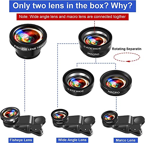 ZQWINT Phone Camera Lens 3 in 1 Phone Lens Kit, 198 Fisheye Lens + 120 Super Wide-Angle Lens + 20x Macro Lens for iPhone Samsung Android Smartphone