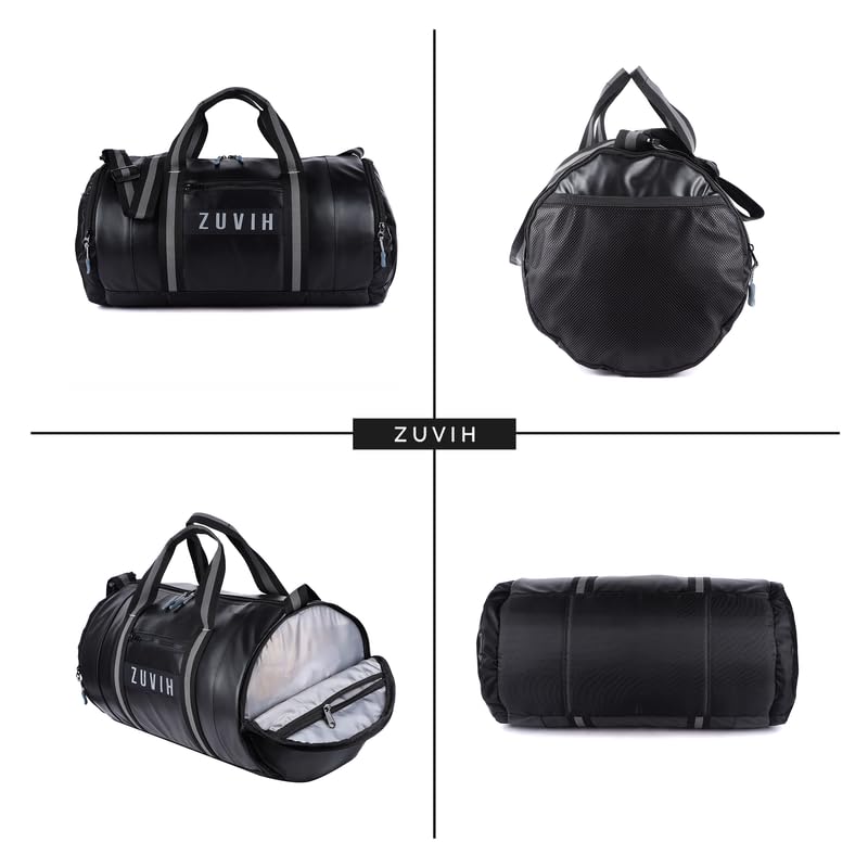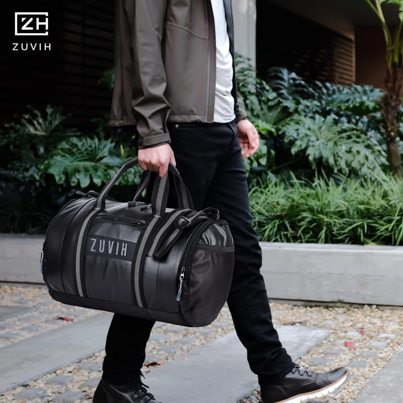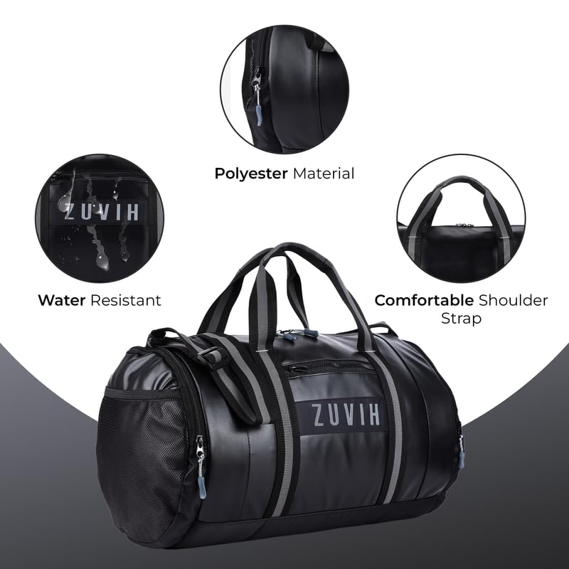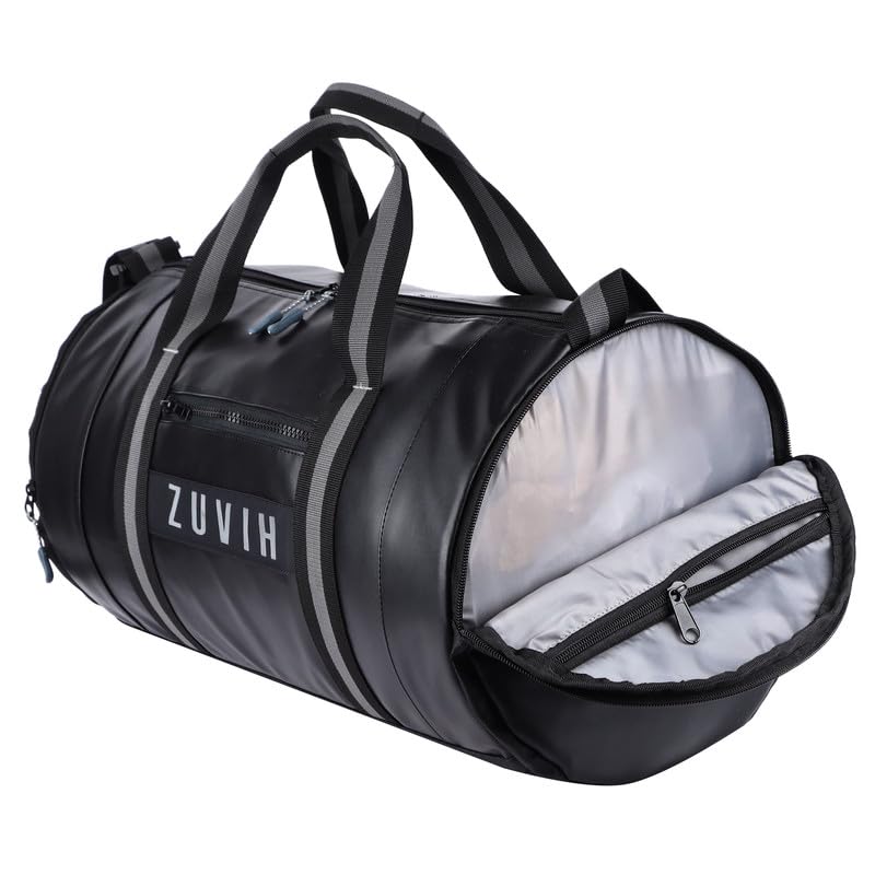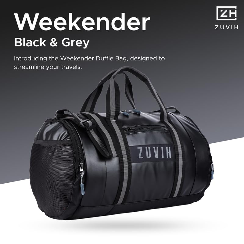 ZUVIH Weekender Premium Multi-Purpose Duffle Bags for Men and Women Water-Resistant with 6 Zipper Compartments, Quality Drum Bag with Twin Color Belt – Perfect for Travel, Gym – Black/Grey
