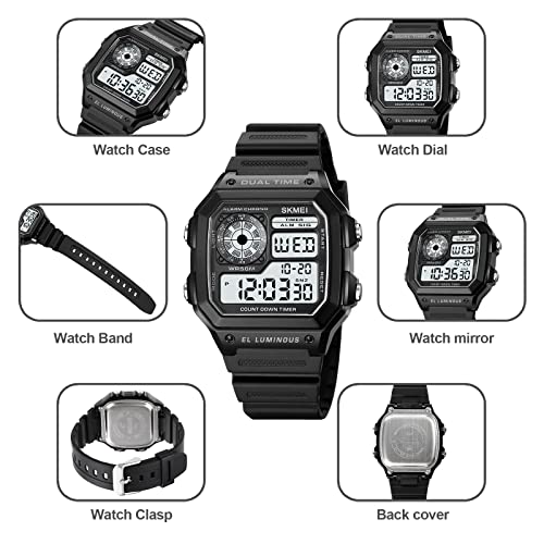SKMEI brand Outdoor Sport and Fashion Casual Style. We are committed to providing the best products, the best service. This fashionable digital display led wrist watch offers high precision and elegant appearance. This watch is very durable and supports long time using. Smart looking watch with an ABS case and a square dial. sports and fashion casual design with digital time display, lead you to classic and business fashion. Its sleek design also reveals your good taste in fashion. Classic Business Casual Dress Watch Design, Combines quality, leading-edge fashion and value. Product Features Original Quartz Movement: provide precise and accurate time keeping ABS Case, Key Scratch Resistant Watch Face, Resin glass, not easy to wear 50M Water Resistant – 5ATM: Daily Use Waterproof, Hand Wash, Shower, NO Problem! (Please DO NOT press the button in the water or wear this watch for longtime underwater activities) Feature: Stopwatch, Countdown, Alarms, Calendar, EL Luminous, 12/24 Hour, 2 time Specification Dial Case Width : 1.69 inch / 4.3 cm Dial Case Thickness: 0.51 inch / 1.3 cm Band Width: 0.71 inch / 1.8 cm Band Length: 10.4 inch / 26.5 cm Wrist: 6.5-9.4 inch/16.5-24 cm Watch Weight: 1.4 oz / 40 g Case Shape: Square Case Material: ABS Band Material Type: PU Dial Window Material Type: Resin **NOTE** If mist or droplets found inside watch surface, please contact the manufacturer immediately. Too much water contact will shorter watch life. What Is In The Package Business Casual Watch x 1 SKMEI Original Box x 1 User Manual x 1