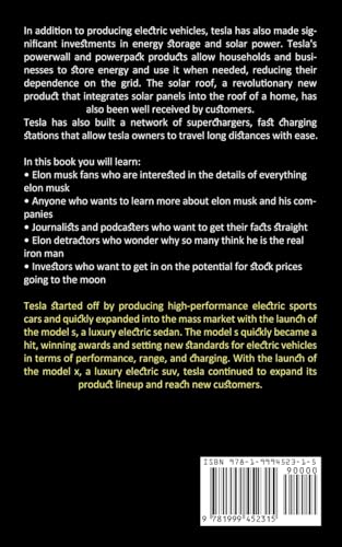 Elon musk fans who are interested in the details of everything elon muskAnyone who wants to learn more about elon musk and his companiesJournalists and podcasters who want to get their facts straightElon detractors who wonder why so many think he is the real iron manInvestors who want to get in on the potential for stock prices going to the moon