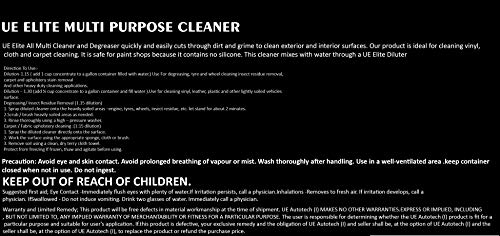 UE Elite Multi Purpose Cleaner. Where to use (Application) Vinyl, cloth, carpet , What does it do ? “UE Elite All Multi Cleaner and Degreaser quickly and easily cuts through dirt and grime to clean exterior and interior surfaces. Our product is ideal for cleaning vinyl, cloth and carpet cleaning. It is safe for paint shops because it contains no silicone. This cleaner mixes with water through a UE Elite Diluter