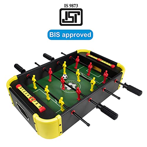 Lightweight & Portable: This medium size with 4 small stand Foosball or Soccer Game is durable,portable and easy to store. It is ISI certified & BIS approved. Recommended age range: 6 years above .The soccer game table features 360° rotated built-in soccer figures, 6 rotating rods with 18 players & 2 football allows 3 rows per team to shoot at goal from any position from any angle.Fun for indoor play & outdoor play & can be played on a flat surface for a full head-to-head competition.